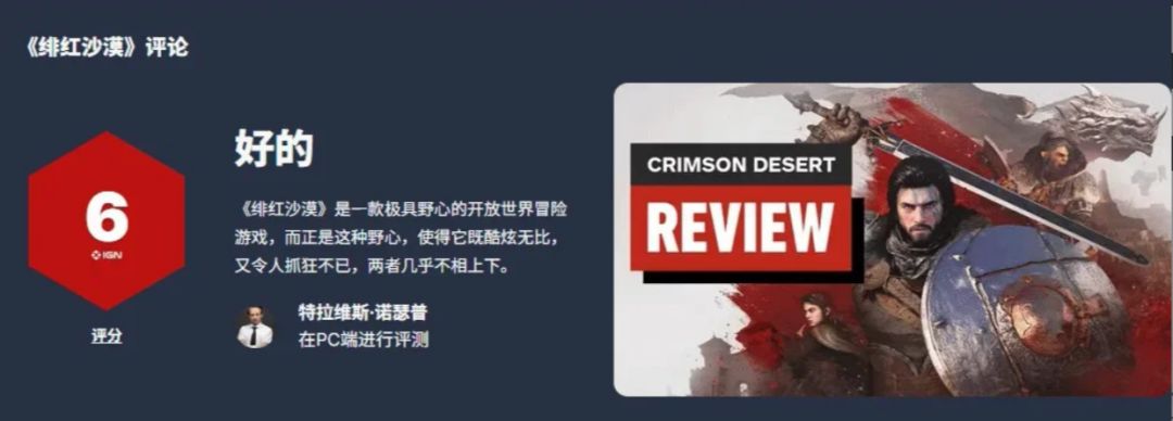 IGN正式公布《红色沙漠》最终评测评分,依旧维持此前暂定的6分,并未因深度游玩后调整分数。此前IGN曾给出临时6分,称需持续体验后敲定最终评分,经过长时间完整游玩,测评团队依旧给出相同分数。