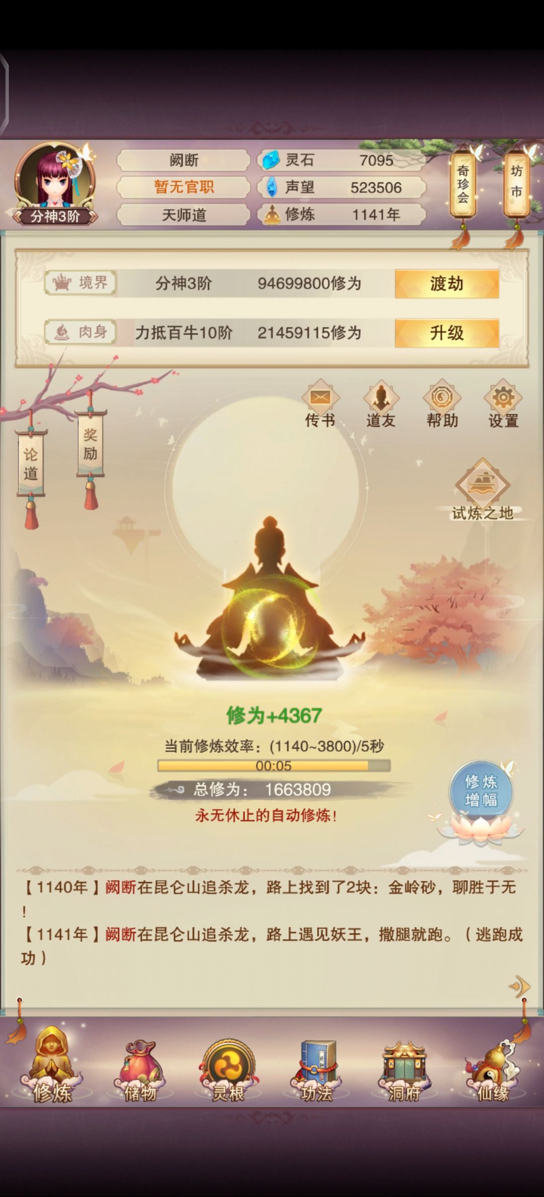 买2个技能点的替换心法(无攻击),1.1w灵石,卖了所有大乘丹和70+合体丹,留了大概30。勉强够卡收益出窍用。