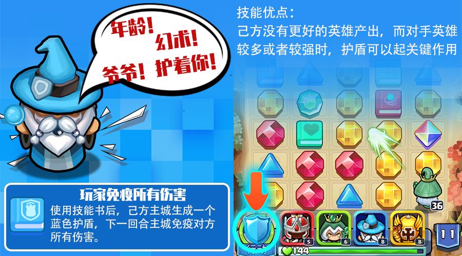 己方没有更好的英雄产出,而对手英雄较多或者较强时,使用技能书后,己方主城生成一个蓝色护盾,下一回合主城免疫对方所有伤害。