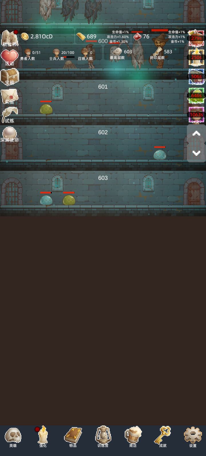 玩了段时间,这游戏还是比较休闲的,一开始就是随便点着玩,像素画风看着很复古,没想到越挂越停不下来。前期试了好几个英雄,最后发现赛勒斯才是真神——移速快得离谱,跑试炼、冲层数效率直接拉满,比其他英雄快太多,前期优先升她准没错,能少走好多弯路。