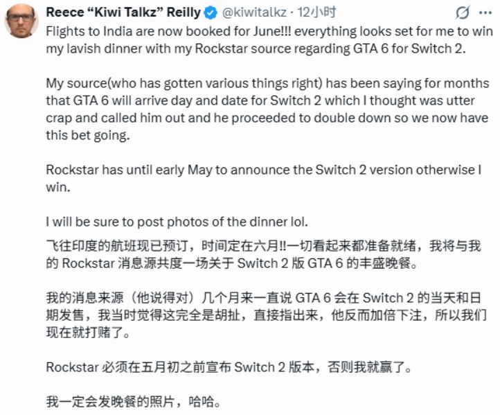 Kiwi Talkz透露,他与一位过往多次精准爆料的内部人士立下赌约,对方坚称《GTA6》会同步登陆 Switch 2,而他本人认为这一消息天方夜谭。双方约定 R 星需在 5 月前官宣该版本,否则Kiwi Talkz获胜。