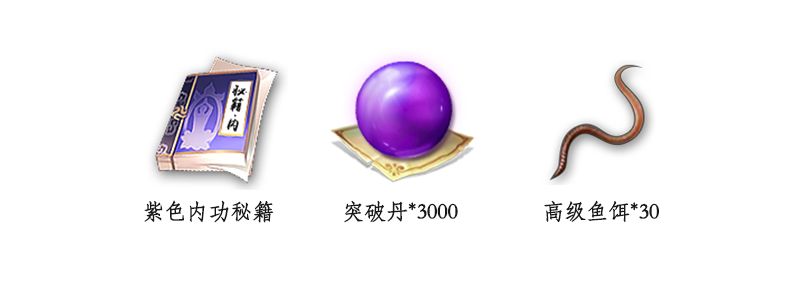 预约2W 随机一本紫色内功秘籍,突破丹*3000,高级鱼饵*30