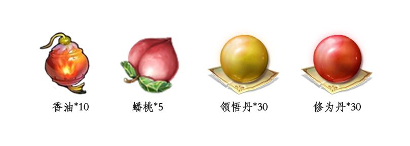 预约5000 香油x10,蟠桃x5,领悟丹*30,修为丹*30