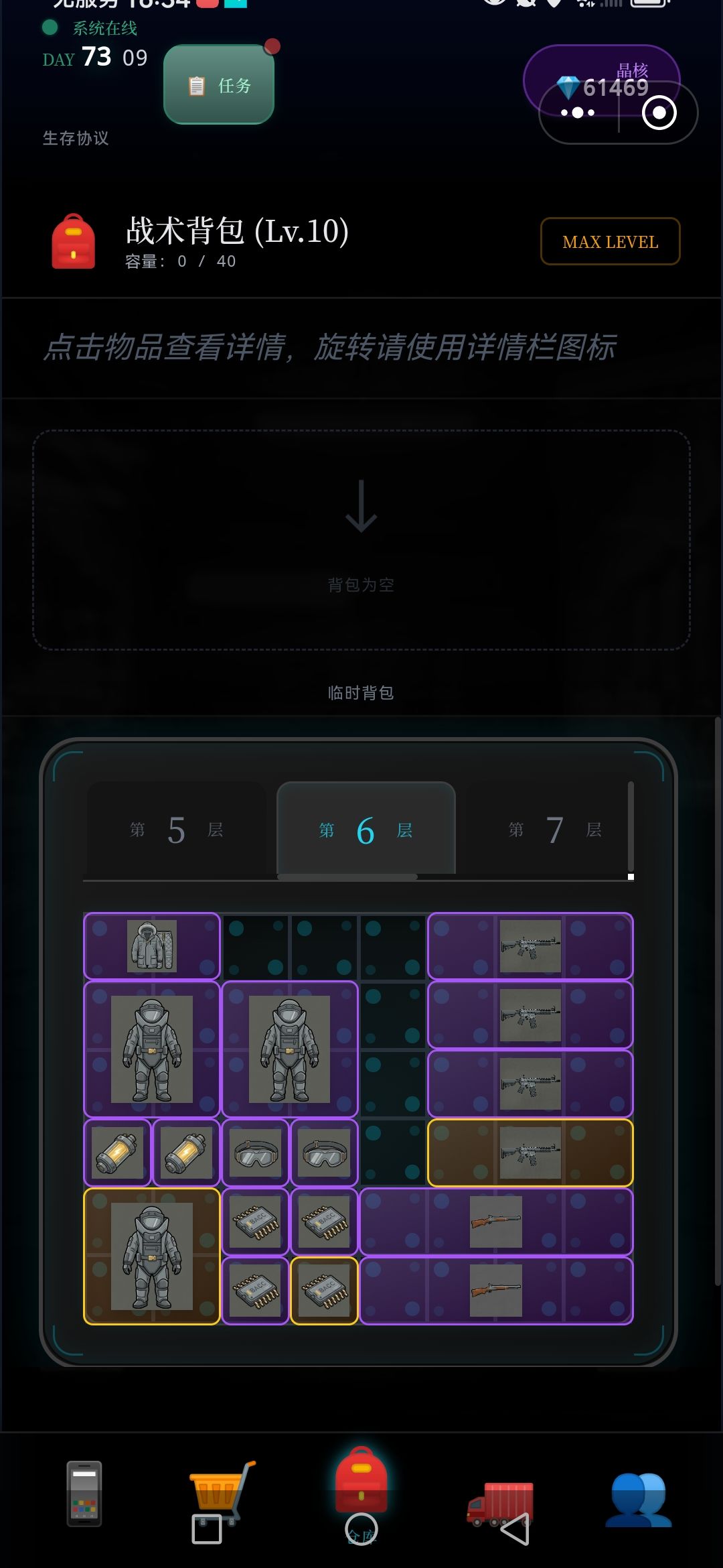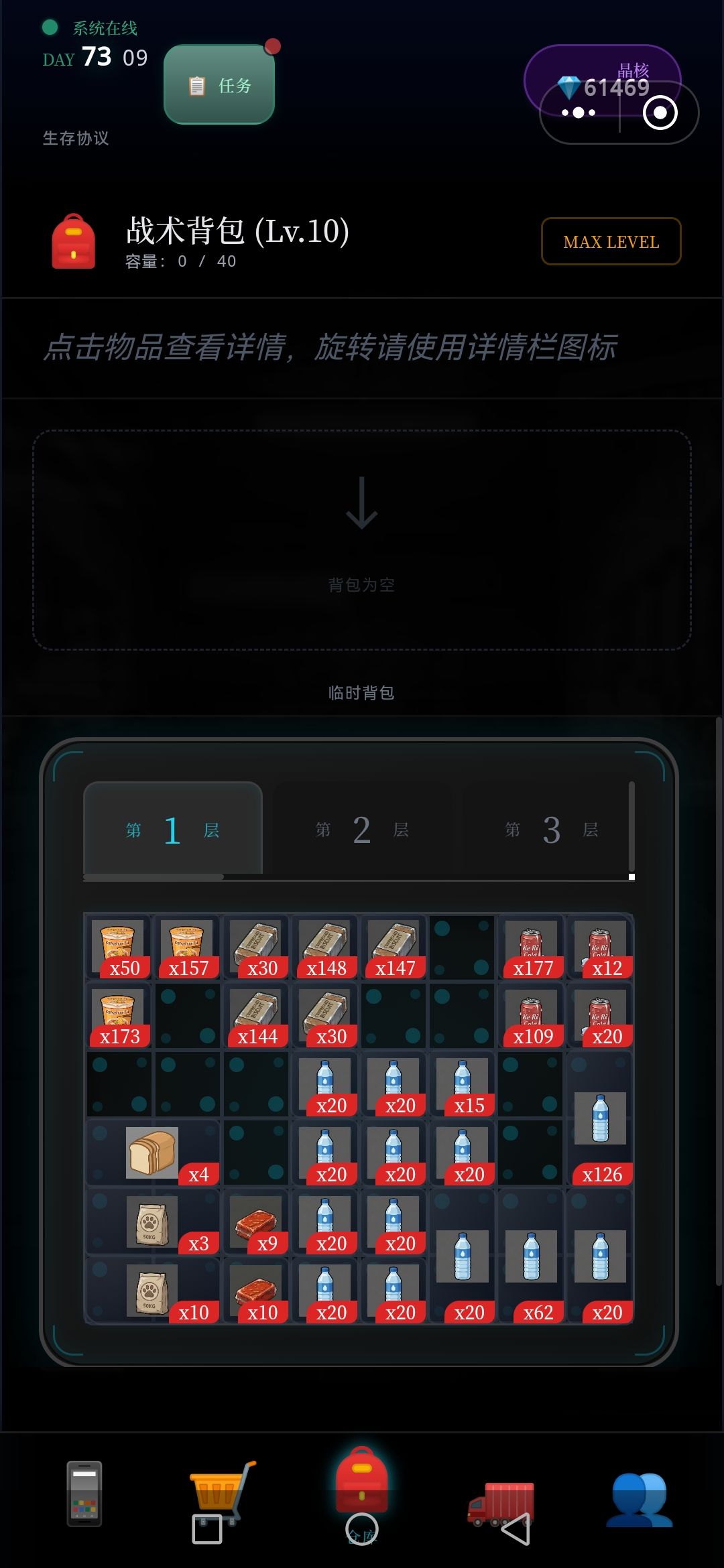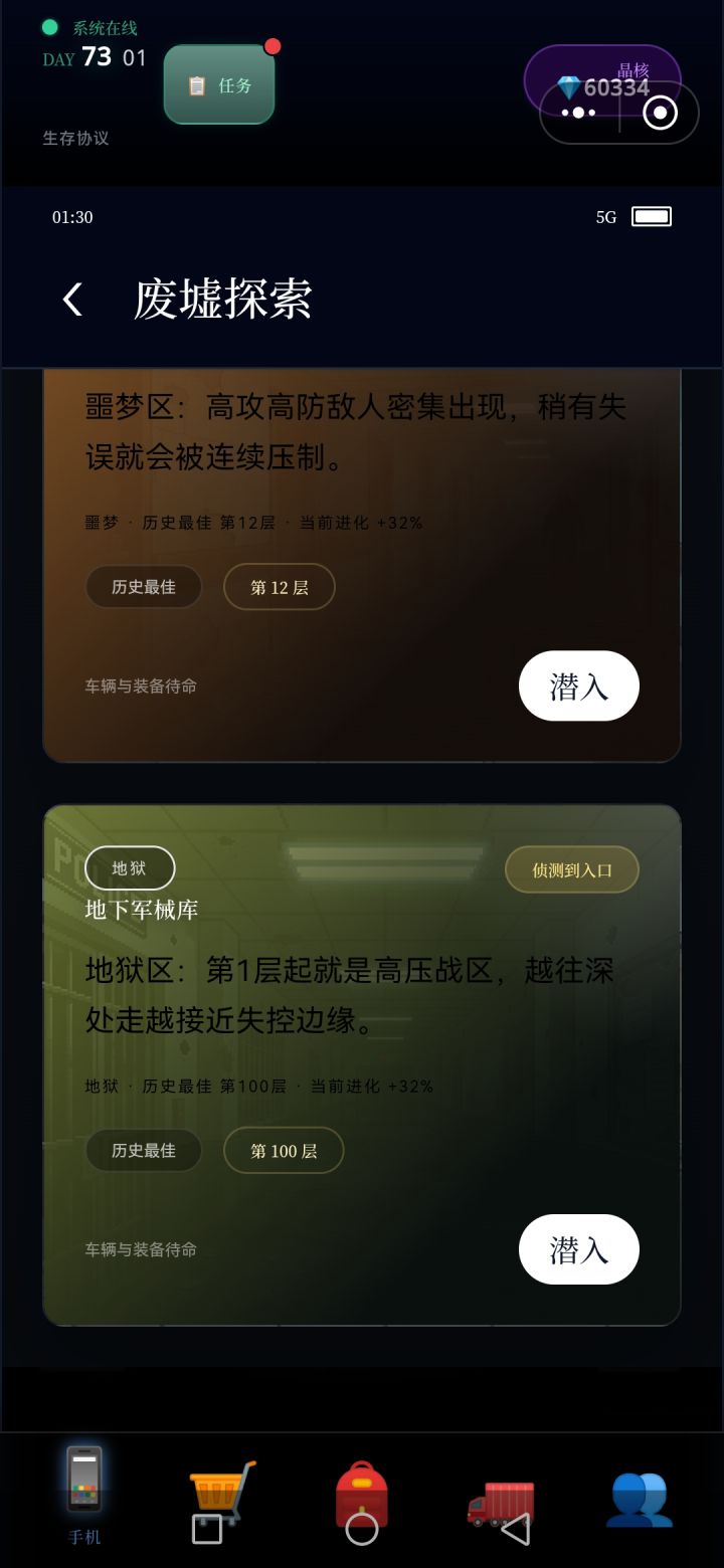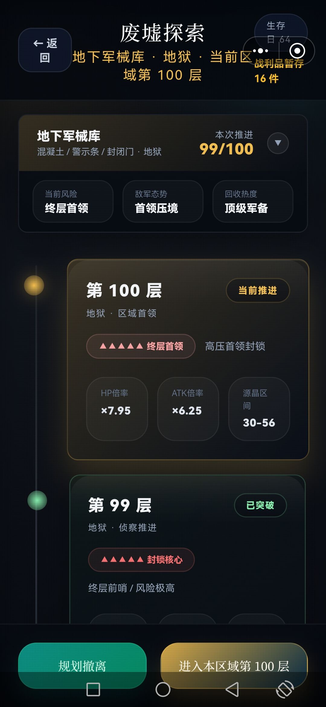 每次探索,5~7层,将满满的资源删选拉回车里,(因为临时背包只有64格,再多也装不下),如此再运用黒市购买的,废墟定位置,接续尚位探索楼层,周而复返,终于突破探索完,目前最难区100层,,