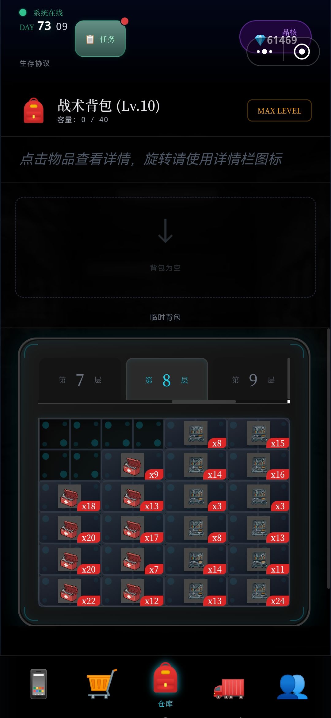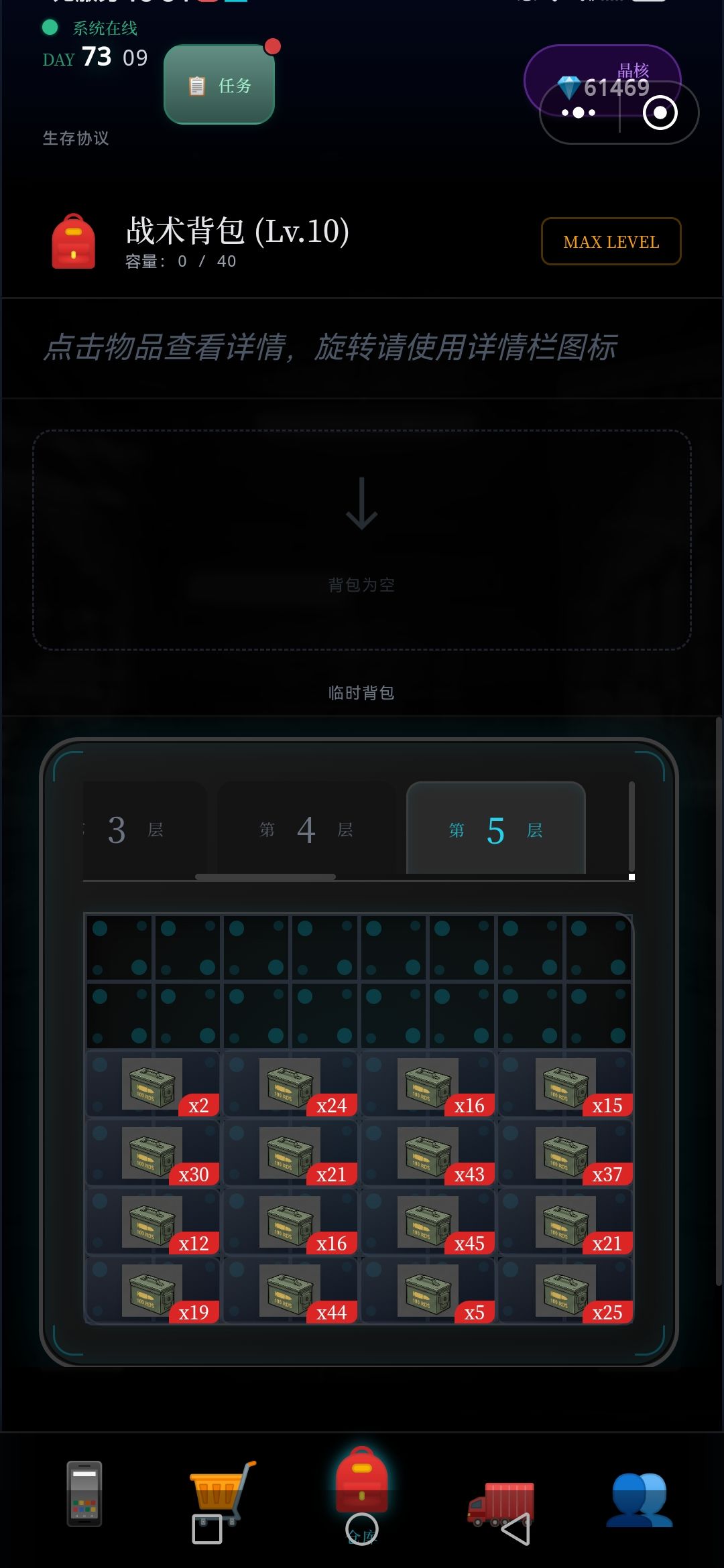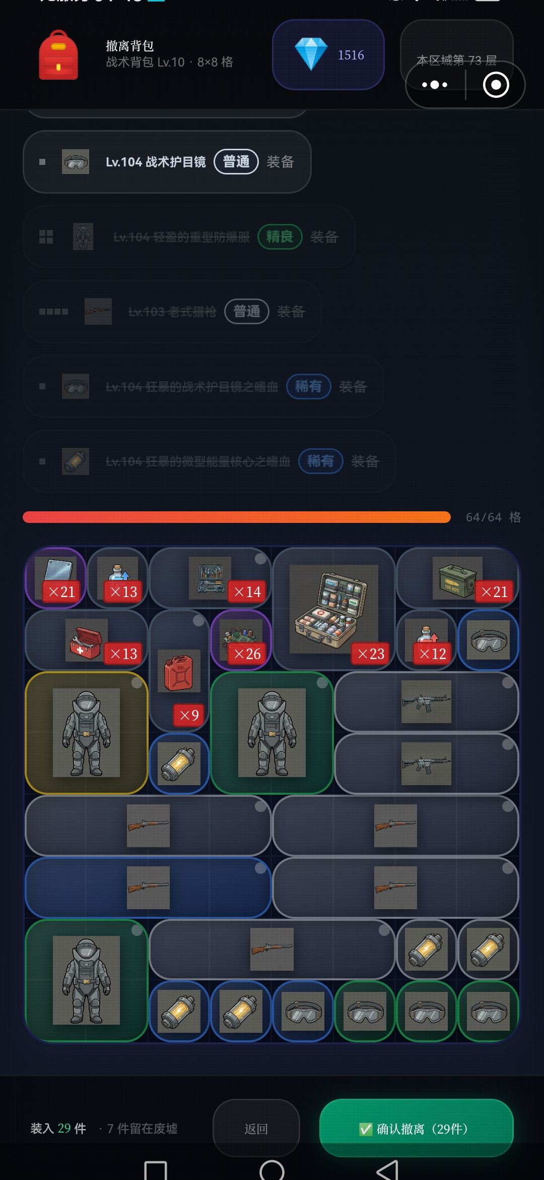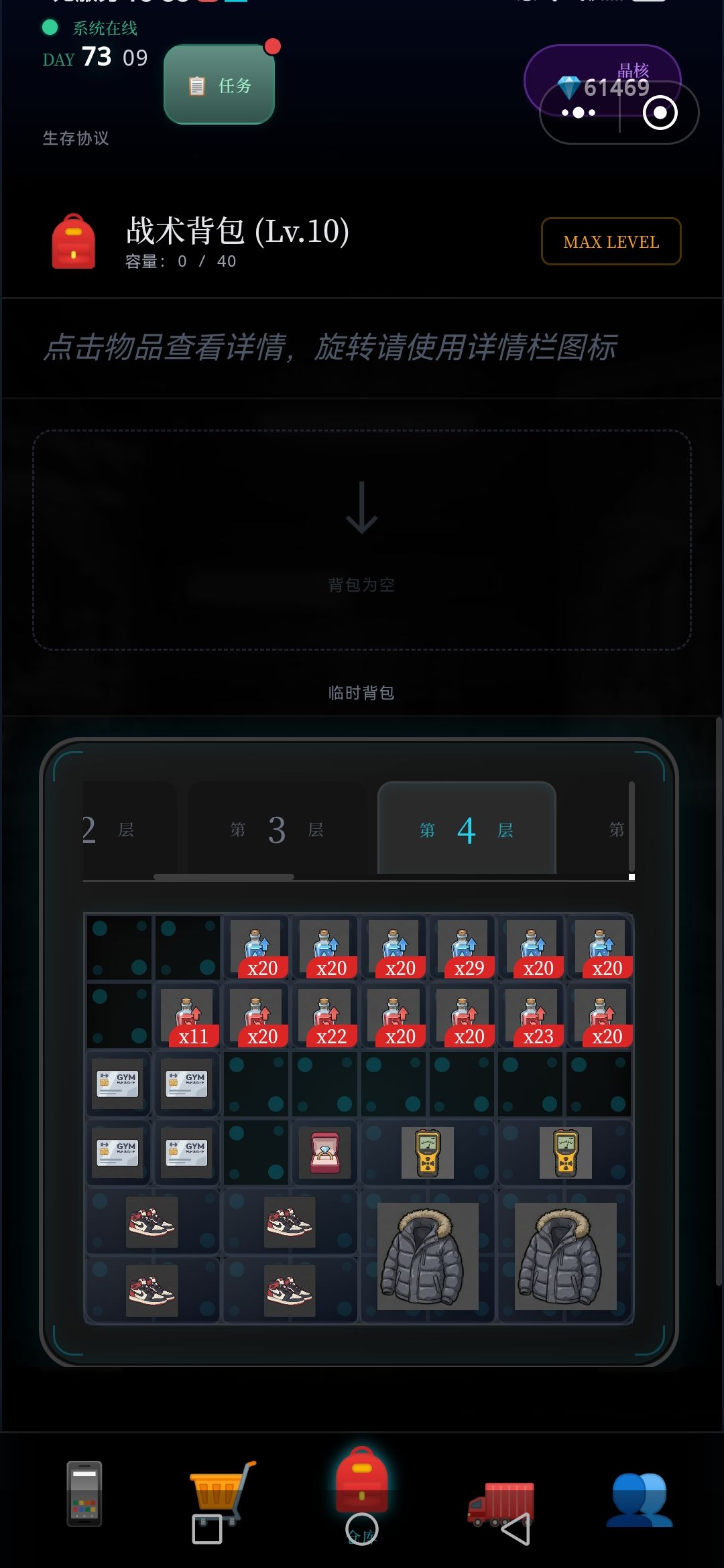 每次探索,5~7层,将满满的资源删选拉回车里,(因为临时背包只有64格,再多也装不下),如此再运用黒市购买的,废墟定位置,接续尚位探索楼层,周而复返,终于突破探索完,目前最难区100层,,