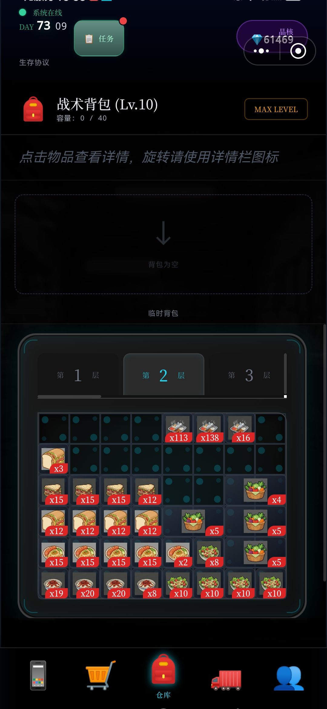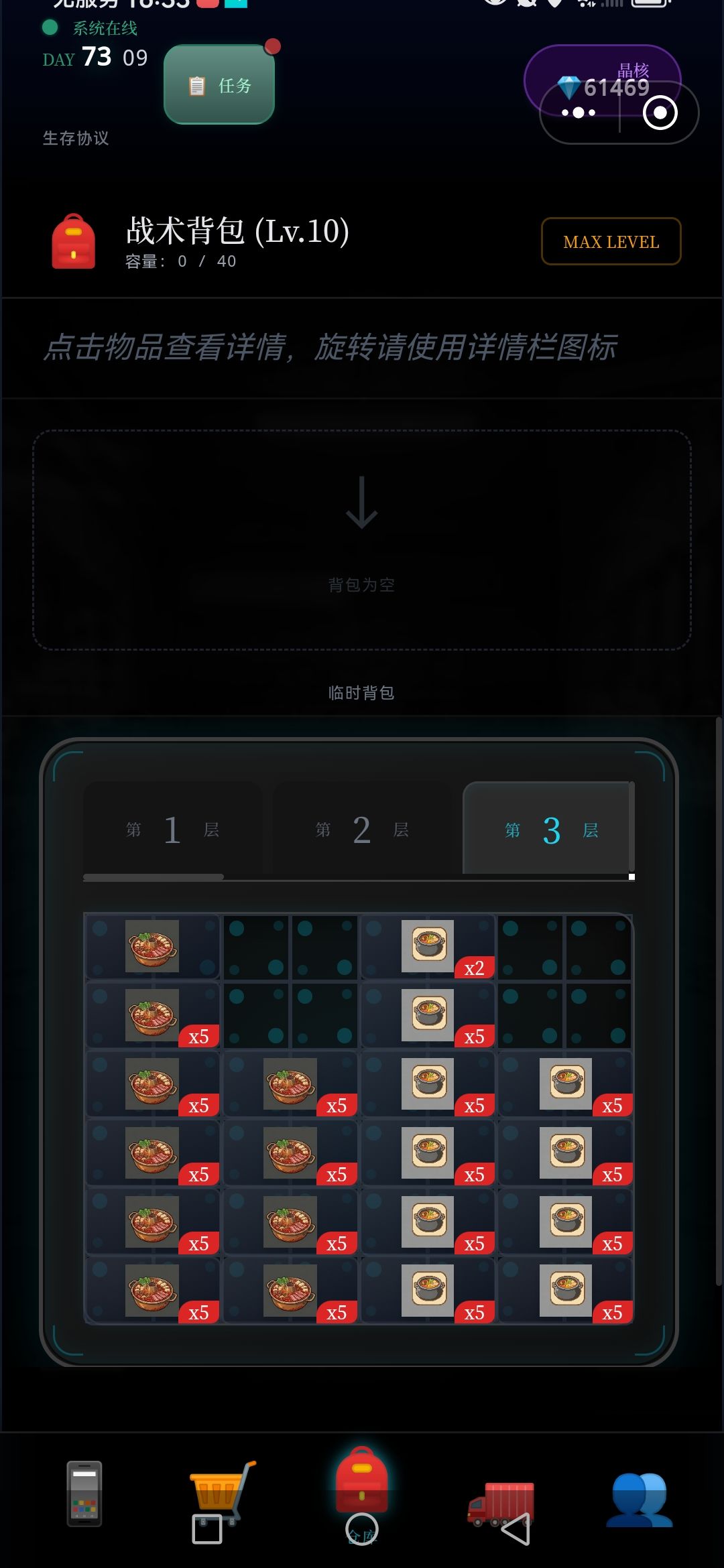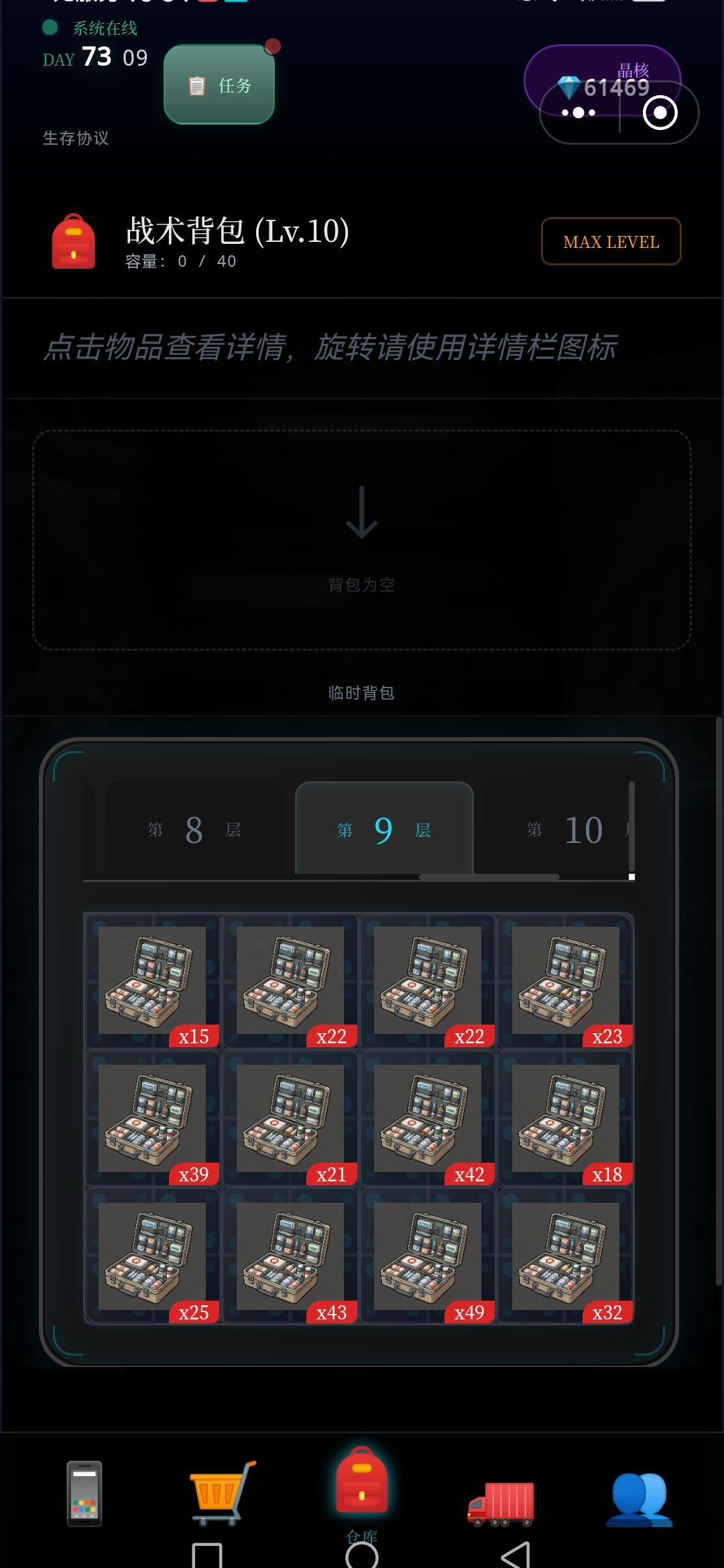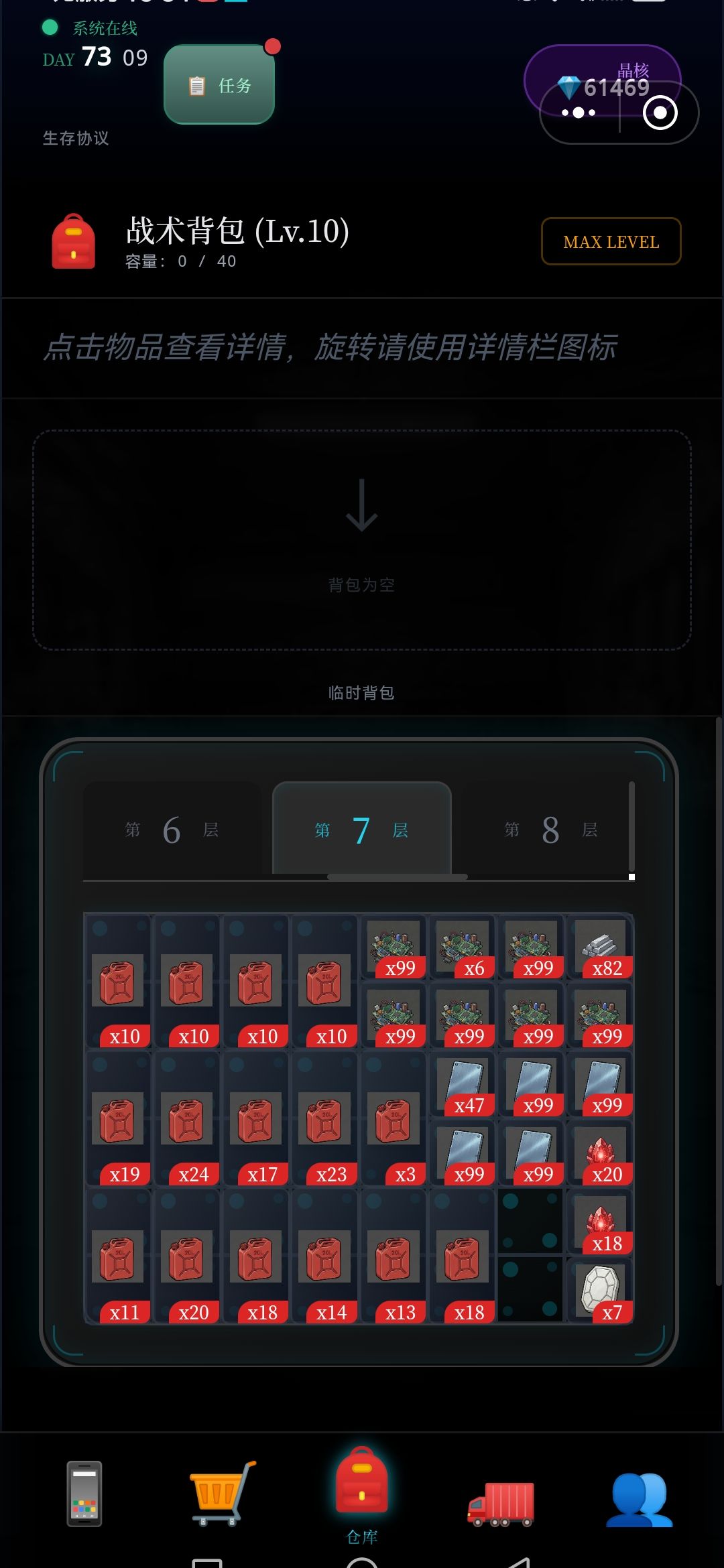 每次探索,5~7层,将满满的资源删选拉回车里,(因为临时背包只有64格,再多也装不下),如此再运用黒市购买的,废墟定位置,接续尚位探索楼层,周而复返,终于突破探索完,目前最难区100层,,