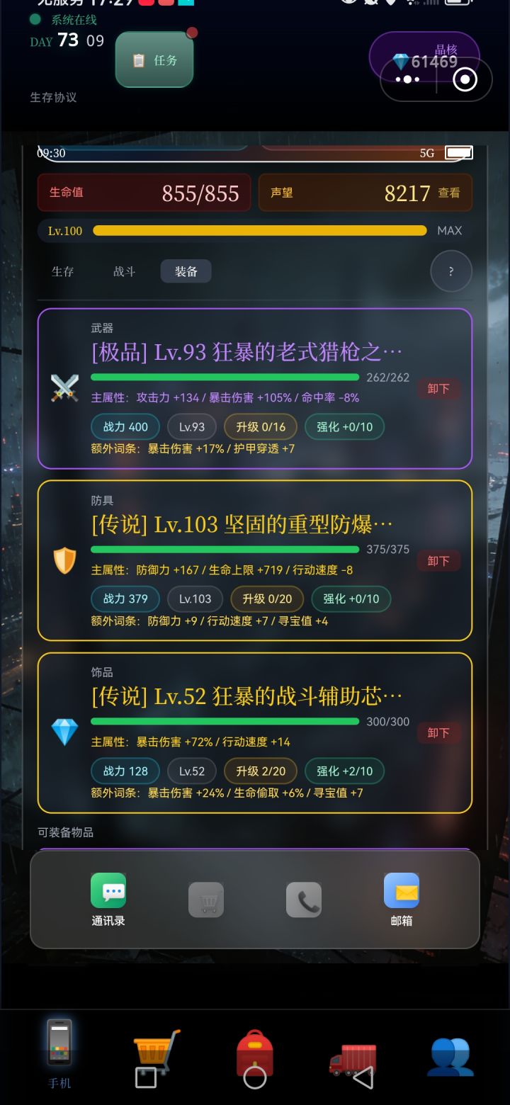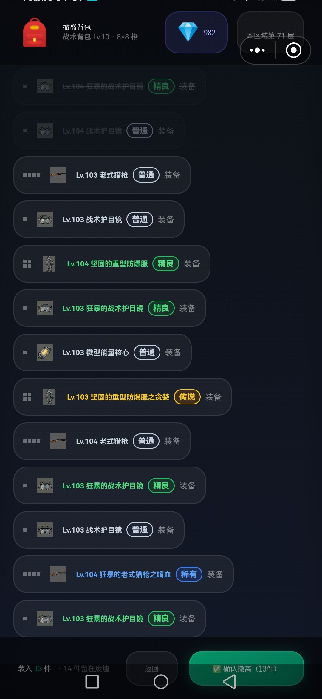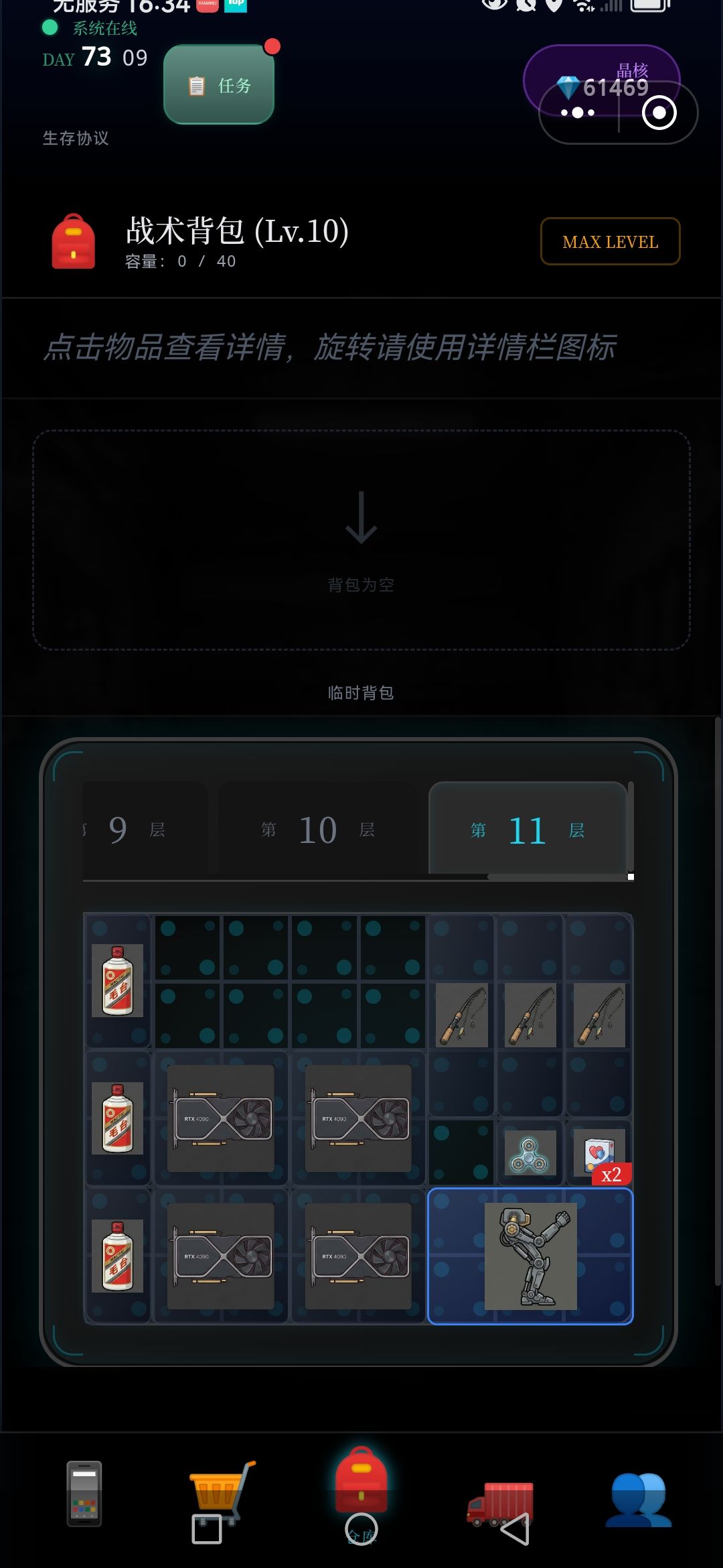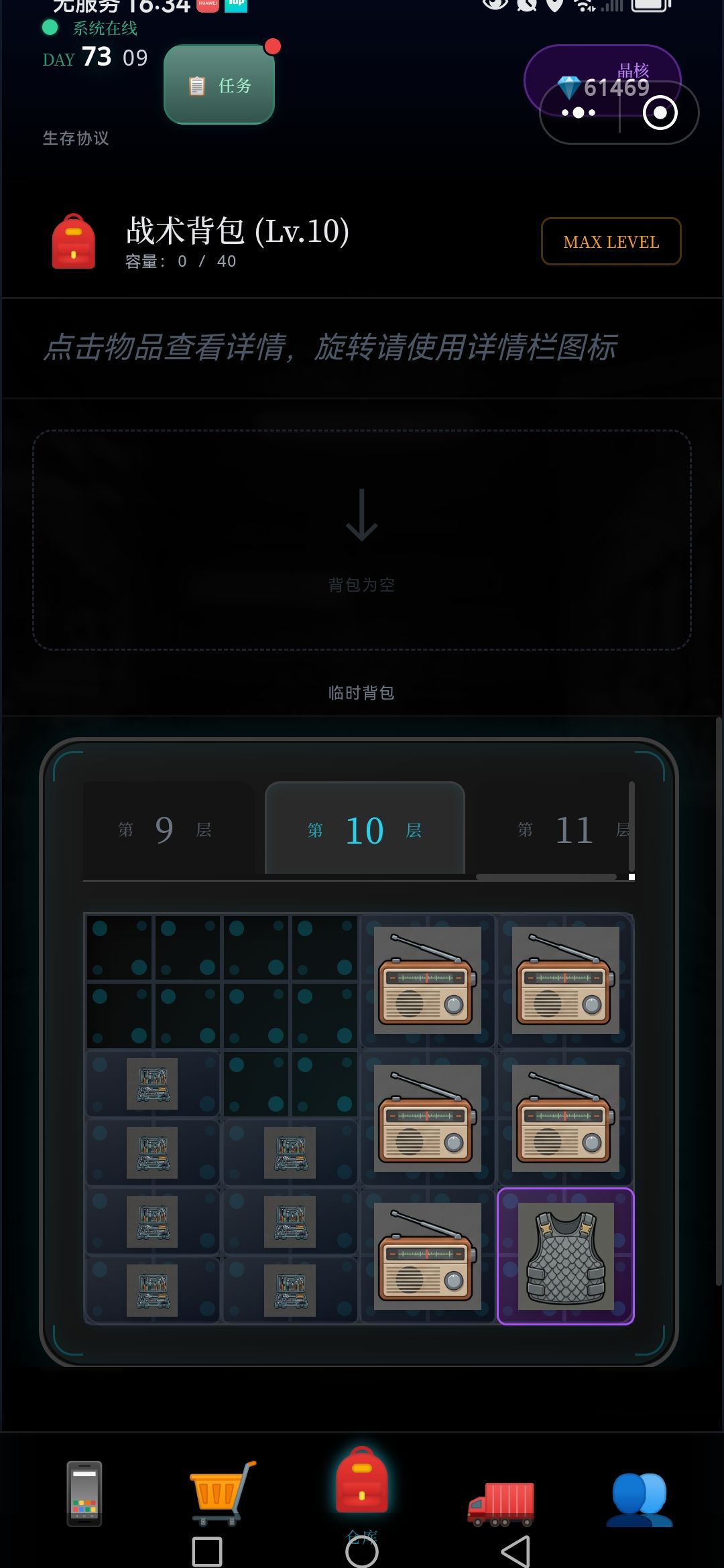 每次探索,5~7层,将满满的资源删选拉回车里,(因为临时背包只有64格,再多也装不下),如此再运用黒市购买的,废墟定位置,接续尚位探索楼层,周而复返,终于突破探索完,目前最难区100层,,
