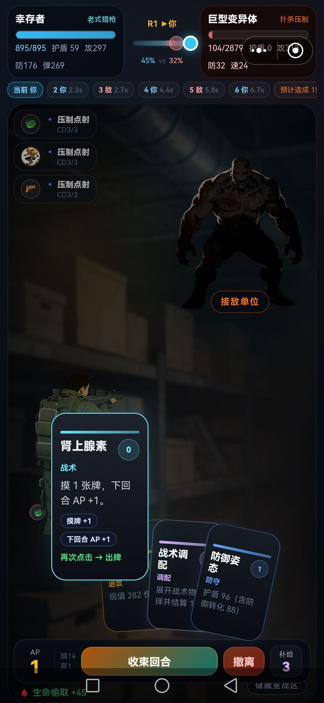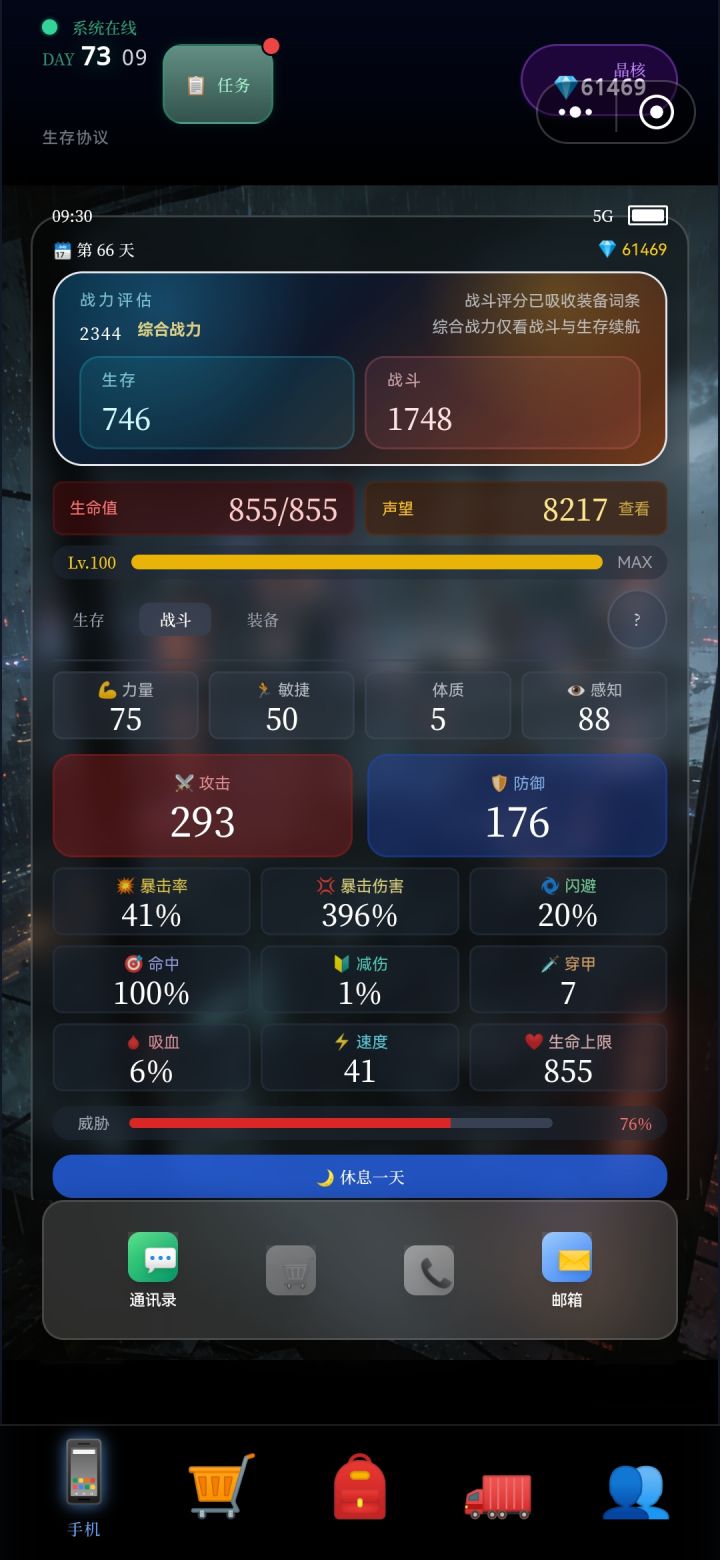 战斗主角属性,因为过程有获得好的装备,利用每天,2次可调整属性,因本人喜欢(用老式猎枪)堆暴击率,速度,力量,(体质没点完全依赖装备血量),可依个人的方式自行调整,(例如携带主武器,突击枪点数调整既不同),,等等,。
