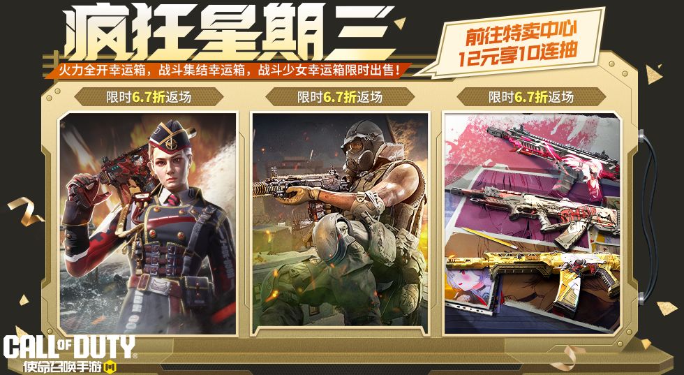 疯狂星期三活动期间,战士们将享受6.7折的超值福利优惠。本次返场的三个宝箱各拥有一次特惠十连抽体验,战士们前往“特卖中心”,花费12软妹币即可十连抽一次!