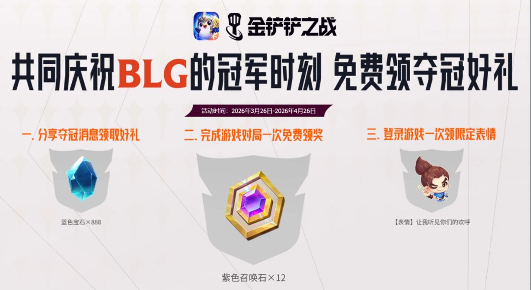 随着BLG战队斩获2026全球先锋赛冠军,《金铲铲之战》同步推出夺冠庆典福利活动,将于3月26日至 4月26日限时开启,与全体弈士共享荣耀时刻。