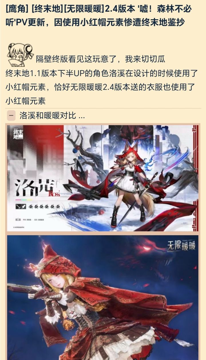 有玩家吐槽说“经典元素用可以,但也不能这么像吧”,也有理性玩家表示“小红帽元素本身就很常见,得看细节是否雷同”,还有人翻出两款作品的设计细节逐一对比,希望官方能给个明确说法。毕竟大家都希望喜欢的游戏能在设计上保持诚意,不过根据以往的情况看,大概率又是不了了之了因为确实很难界定为抄袭。#今天游戏圈发生了啥 #资讯评论员 #明日方舟终末地