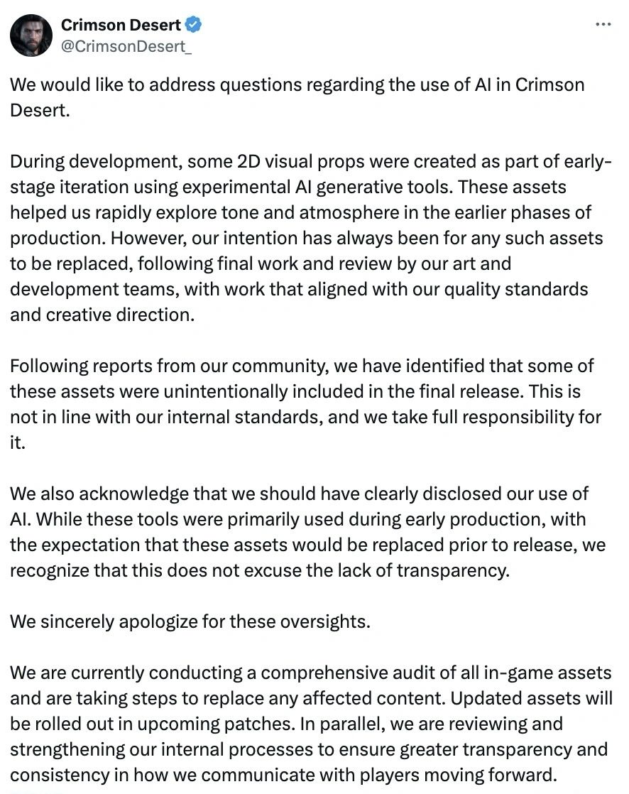 近日,开放世界游戏《红色沙漠》的开发商Pearl Abyss正式对外发声,承认游戏在开发过程中使用了AI生成素材,并表示这些素材原本计划在上线前由美术团队全部替换,最终因内部流程疏漏出现在正式版本中。