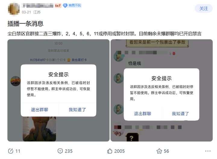 此次群聊异常发生在游戏停服风波后。3月2日深夜,西山居宣布《尘白禁区》启动无限期停服维护,仅称"数据量较大,维护周期可能较长"。停服前,游戏因与中国邮政联名活动涉及"擦边"内容被紧急叫停,随后官方大批删除B站视频,账号内容大幅清理。玩家普遍认为此次停服与内容整改有关,而官群封禁更让开服前景蒙上阴影。