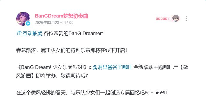 原因和官方宣布与萌果酱谷子咖啡展开联动有关,此次联动主题咖啡厅微风游园即将举办, 据悉此次线下活动将以春日、游园等元素为概念,或许将会推出相关主题餐品及周边商品。