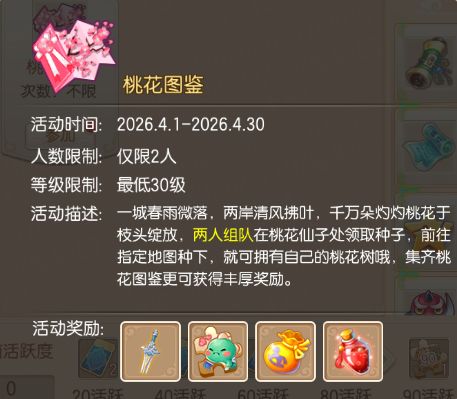 4月1日-4月30日,等级≥30级的少侠请两人组队参与【桃花图鉴】活动,按照活动指引完成种子的种植,即可收集桃花瓣,解锁图鉴。