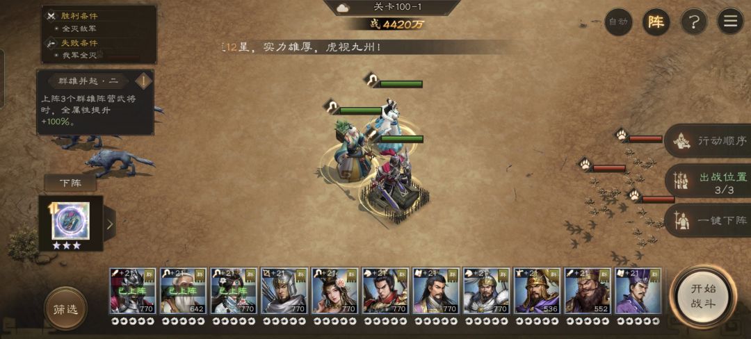 第一回合往后跑一点,这关要要注意,三个狼的伤害非常高,高顺可能撑不到大招