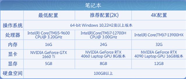 1.笔记本电脑最低配置:GTX 1660Ti、推荐RTX 4060、最佳RTX 4090;