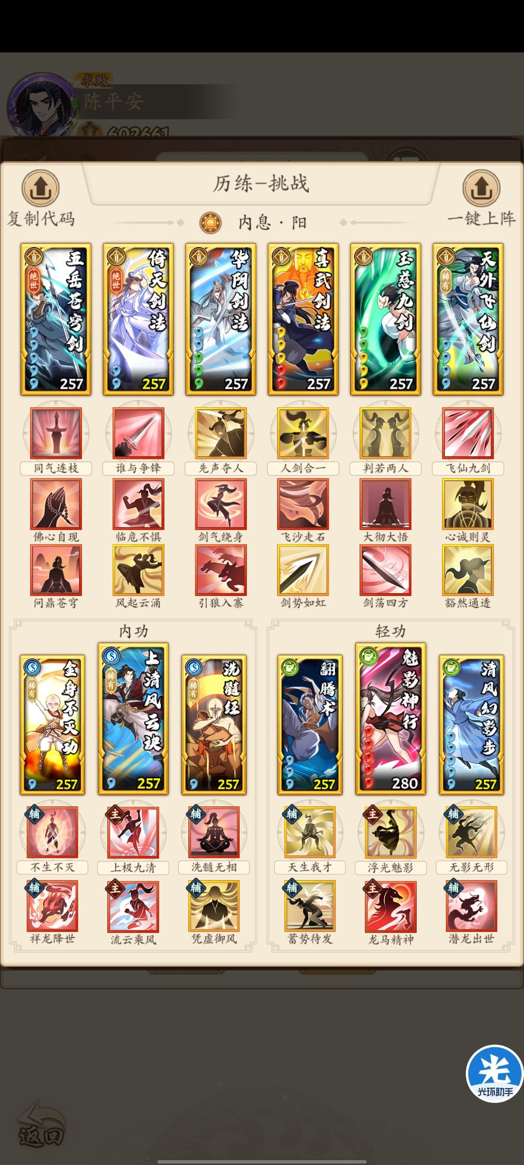 前期过渡:气海刀法和五岳苍穹剑可以无脑带,做好挨打的心理准备,心态放好。玉慈九剑最好开出大彻大悟再用会稳定很多。小渔剑法,游侠剑法,无问剑法对阳剑来说不算很重要,可换可不换。内功主运金钟罩,副运太乙真气/玉女心经和上清风云决(没出之前随便带),轻功主魅影神行副运石破身法和清风幻影步。