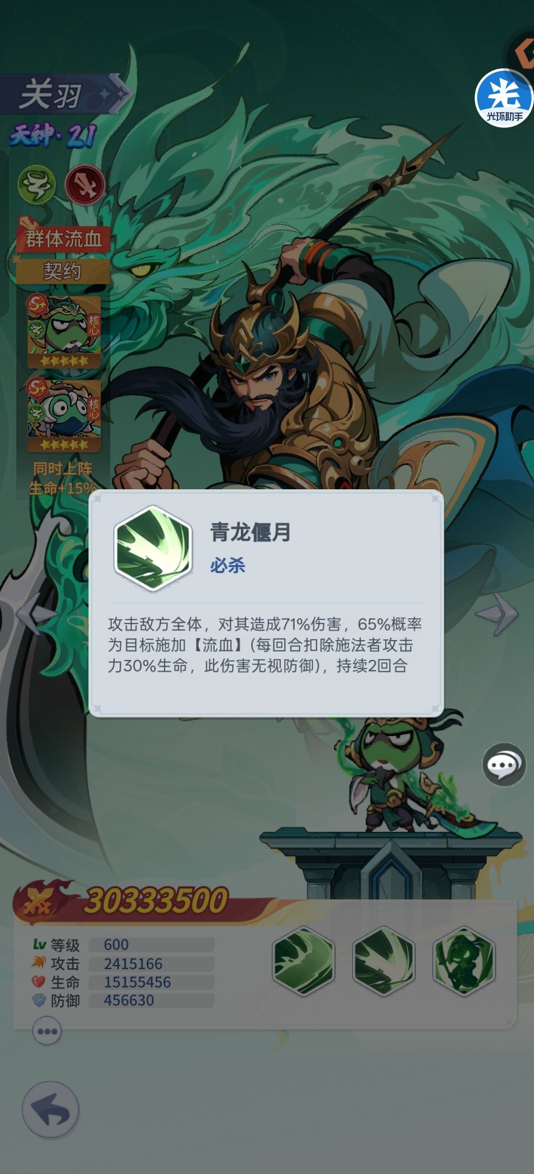 关羽可以有效防止流血被清除,被清除或消失之后又会继续蔓延,可谓是春风吹又生,还可以为敌方稳定施加流血