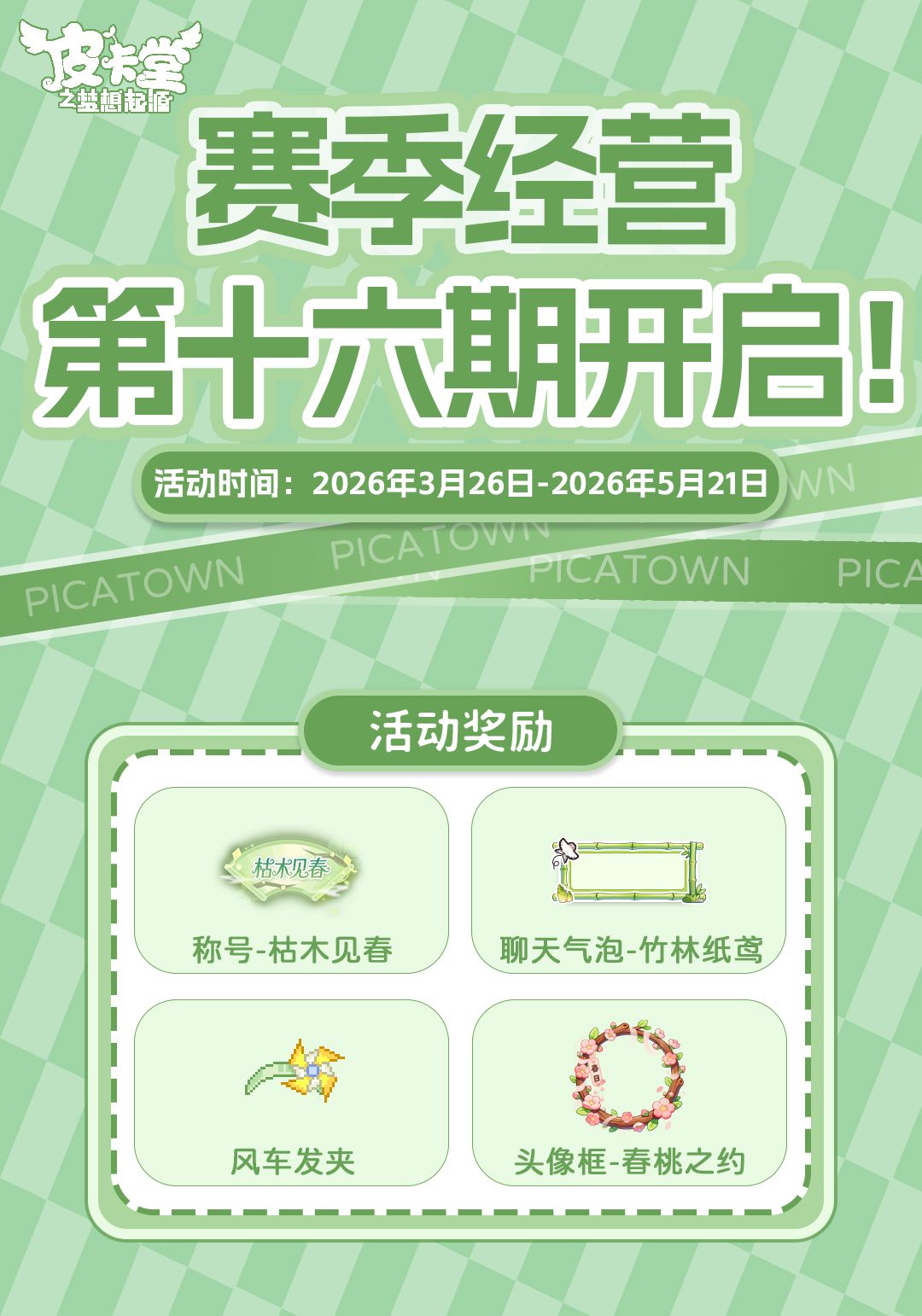 -【赛季经营】完成赛季任务可获得S15赛季专属称号「枯木见春」、配饰「风车发夹」、头像框「春桃之约」、气泡框「竹林纸鸢」!挑战完成任务领取全新的赛季奖励吧~