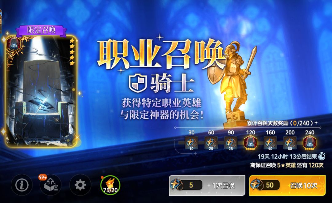 - 每召唤1次,保证召唤次数将扣除1次(最多120次),若保证召唤次数全部扣除,将会有100%的几率在下一次召唤中获得5★骑士职业英雄。