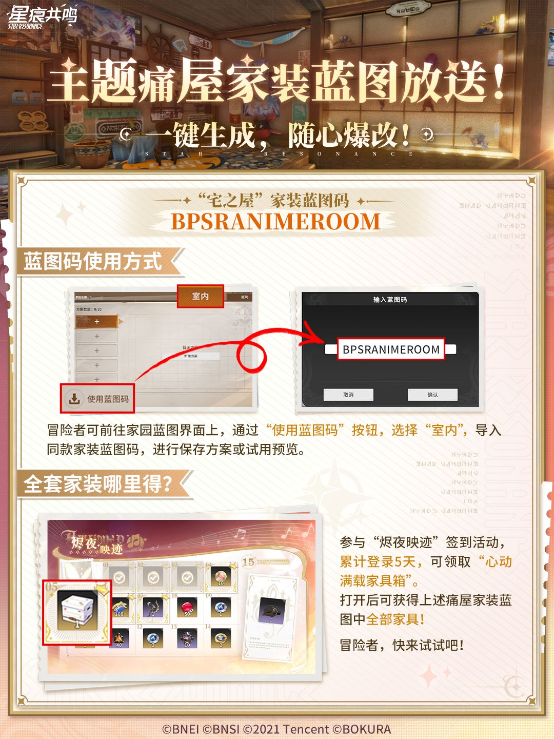 参与「烬夜映迹」签到活动,累计签到 5 天,就能领取「心动满载家具箱」。开箱即得全套痛屋家具,使用上述蓝图码,即刻解锁冒险者的专属家装!