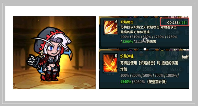 4、1技能CD18秒,最多可缩短至9秒,附带四技能增伤。