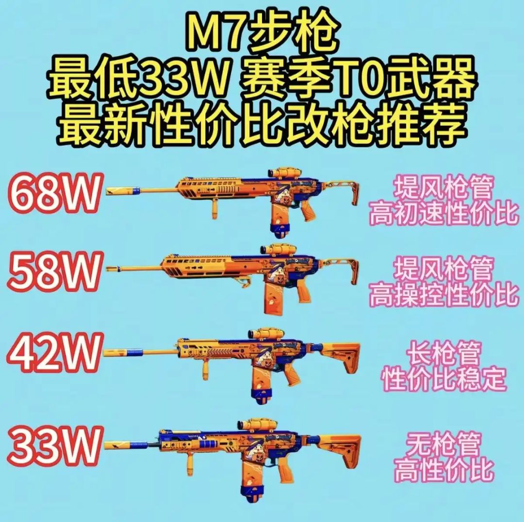小编给小伙伴们整理了一下S8赛季M7的改装方案,供大家参考。105w满改轻语高稳定:M7战斗步枪-烽火地带-6JF76GO0EQ2STTMJGRREJ102w95高腰射开镜版:M7战斗步枪-烽火地带-6JBK7900EQ2STTMJGRREJ99w堤风三倍镜:M7战斗步枪-烽火地带-6JAD13S0EQ2STTMJGRREJ90w满改45发弹匣:M7战斗步枪-烽火地带-6JF76L40EQ2STTMJGRREJ80w堤风枪管稳定:M7战斗步枪-烽火地带-6JF76MK0EQ2STTMJGRREJ