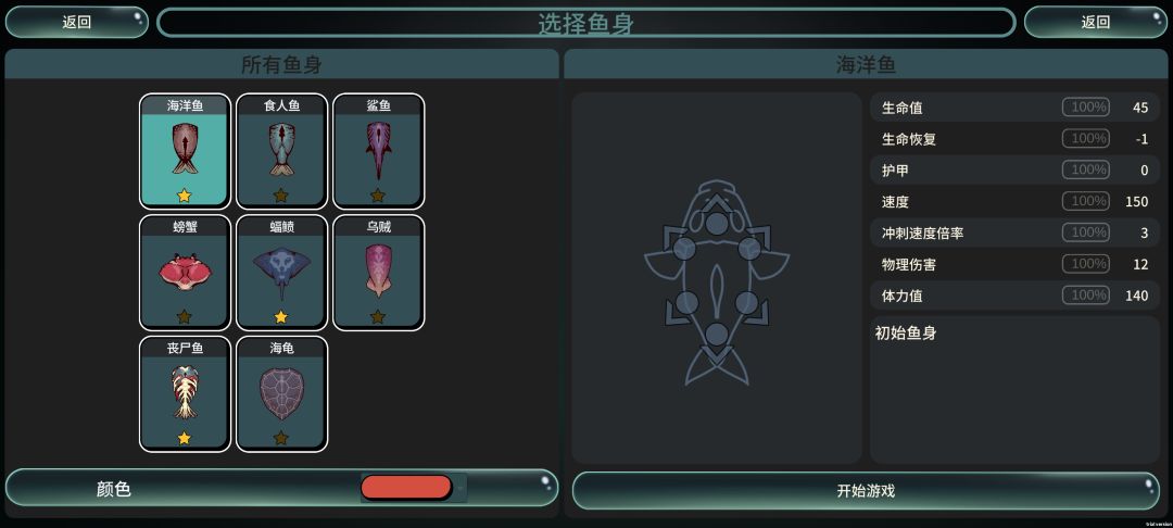 进入游戏,刚开始只解锁了探索模式(池塘一)。选择初始海洋鱼后,直接开始游戏。