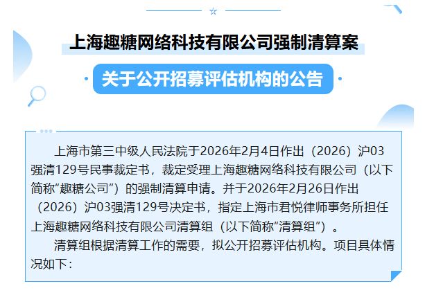 上周,担任趣糖网络破产管理人的君悦律师事务所发布公告,公开招募评估机构,以评估主要由《米姆米姆哈》组成无形资产价值。标志着趣糖网络破除清算进一步推进。