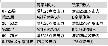 这里说明一下这个500%。假如正常状态下,敌人一层加成是1点攻击力。那么每选择一次全军休整,敌人就会在接下来的25层里多增加100攻击力。这部分加成会一直存在,直到轮转。具体如下图