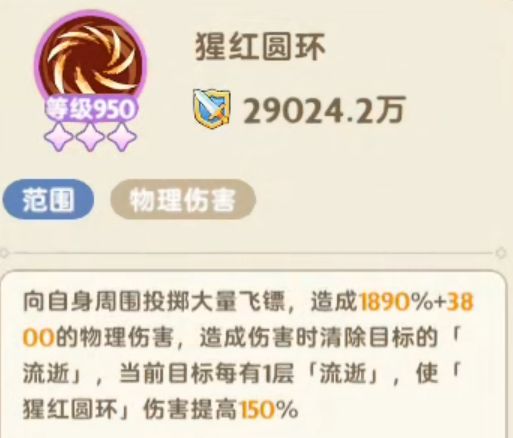 总结来说就是很烂,烂完了,四个技能只有核心有伤害,其他都是增伤,而核心只有50%的倍率,是的你没看错,50%,直观感受可以看下面的伤害占比,猩红圆环一个白板技能,都能打154AB,说明增伤非常高,但是这也反应了核心技能伤害有多低。而且12转是靠核心打伤害,但是官套带的差价,这技能是非核心伤害加成,结果带差价反而伤害最高。