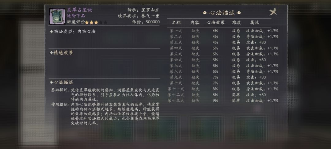 以地阶功法举例,这个攻击加成+身法加成(双加成我们一般讲为双百分比)就肯定是输出弟子的最优解了。如果拿不到这个就往下找,单攻击加成,或者单内外伤(看你弟子的输出属性)。