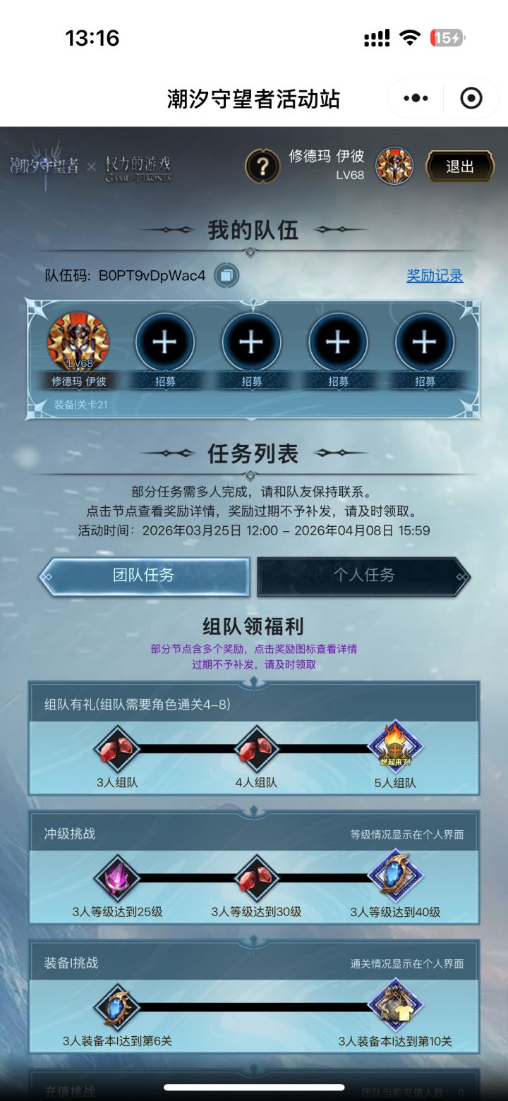 我的队伍码:【B0PT9vDpWac4】,微信小程序搜索“潮汐守望者活动站”,加入我的队伍一起领限定皮肤、表情和召唤水晶等奖励!