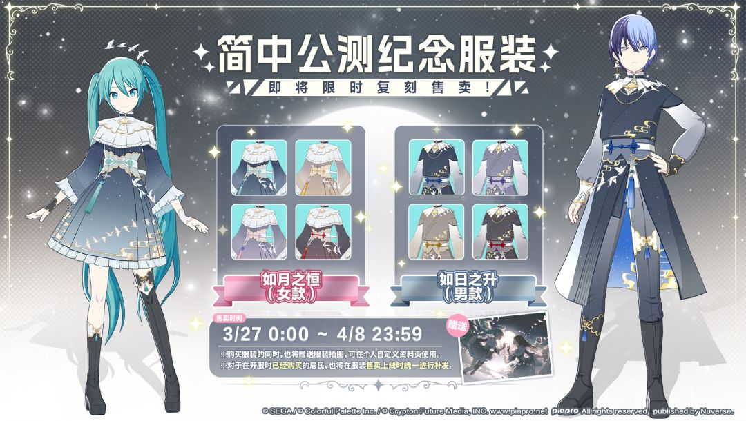 并且,本次特卖将会复刻售卖「简中公测纪念服装」。「如月之恒(女款)」、「如日之升(男款)」将进行返场售卖。购买服装的同时,也将赠送服装插图,可在个人自定义资料页使用。