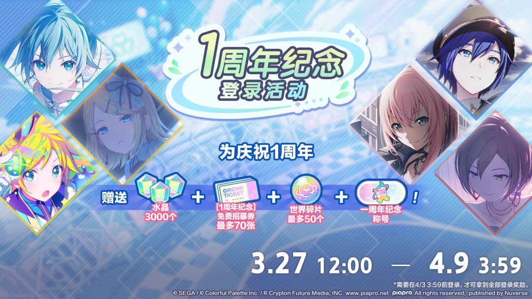 活动期间前七日登录游戏,每日都可领取[1周年纪念]免费招募券×10;还可获得世界碎片×50以及《初音未来:缤纷舞台》一周年称号征集获奖作品在内的各类资源奖励哦~