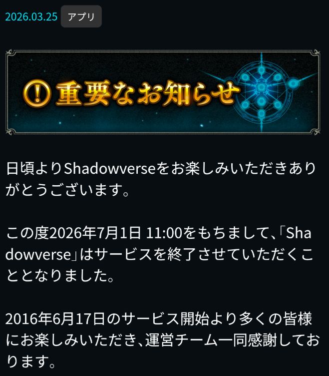 2026年3月25日,Cygames 旗下运营十年的全球知名卡牌游戏《影之诗》(Shadowverse)官方发布停运时间表,宣布游戏将于6月30日(太平洋时间)*正式结束运营。