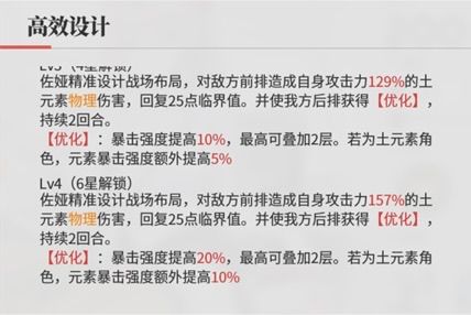 使我方后排获得2回合【优化】状态:暴击强度提高 20%,最高叠加至 40%。若为土元素角色,元素暴击强度额外提高 10%(20%+10%=30%*2=60%),恢复 25 点临界值。