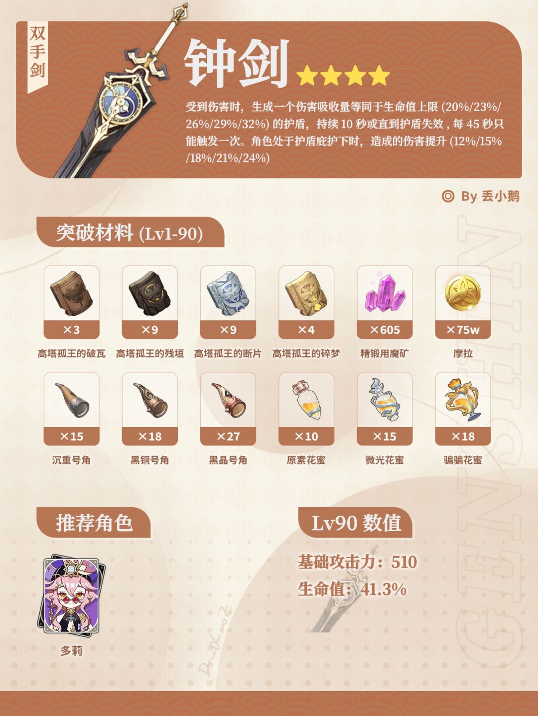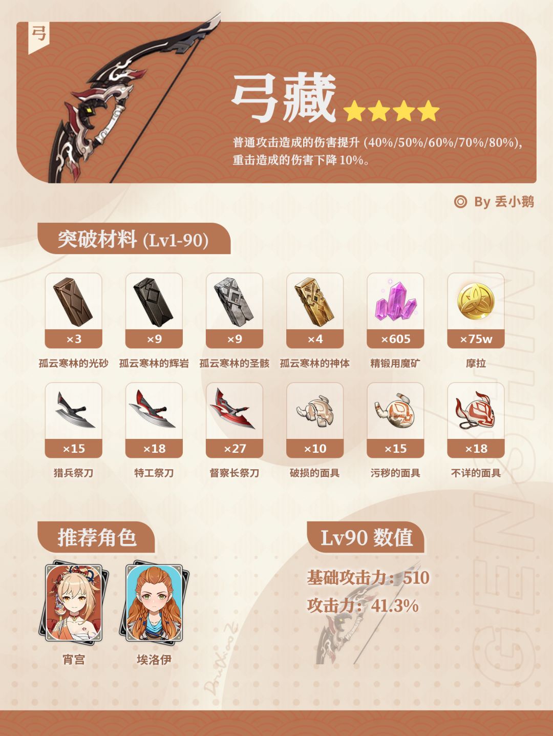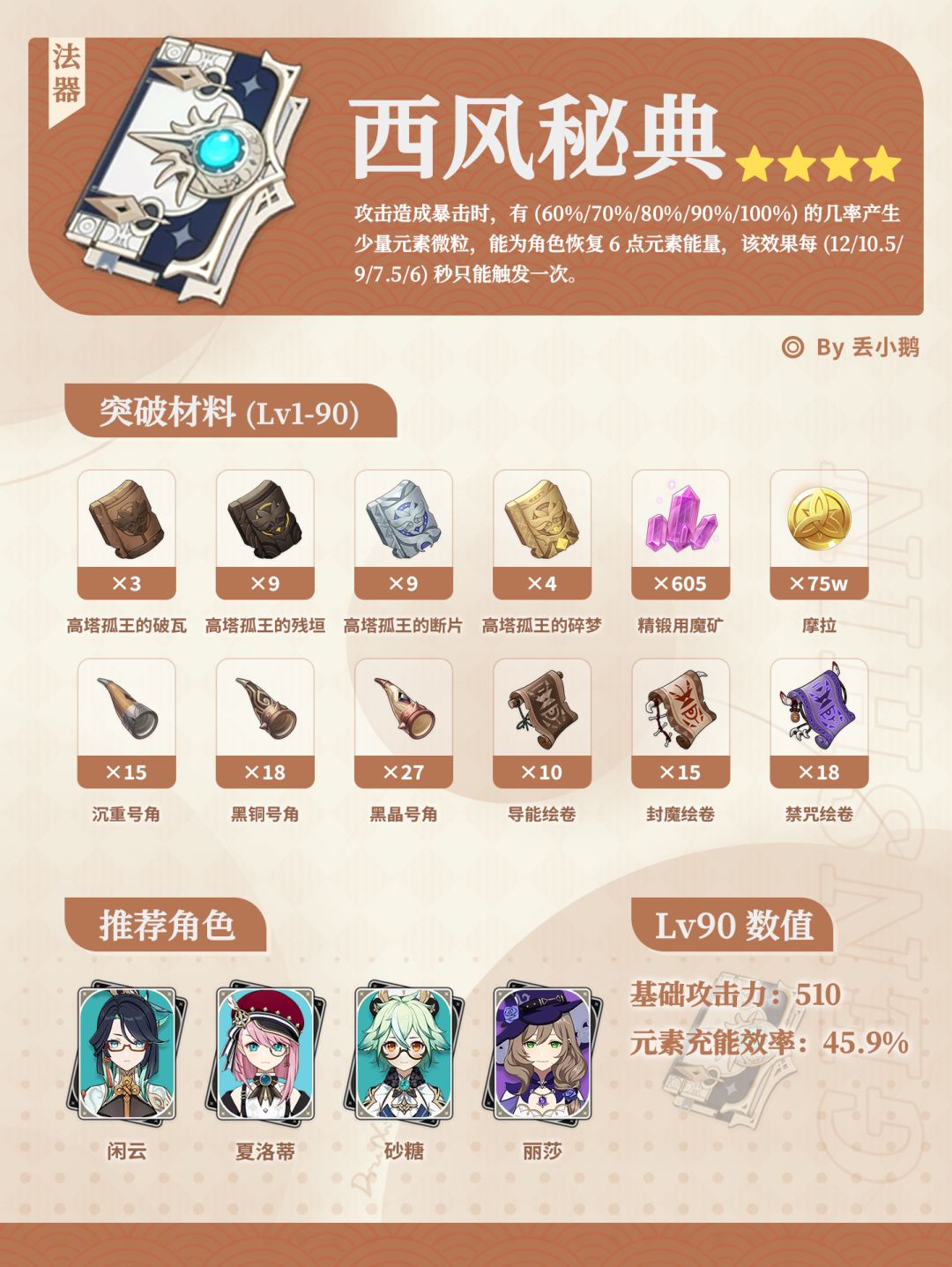 ● 4星武器:「单手剑·笛剑」、「双手剑·钟剑」、「长柄武器·西风长枪」、「法器·西风秘典」、「弓·弓藏」