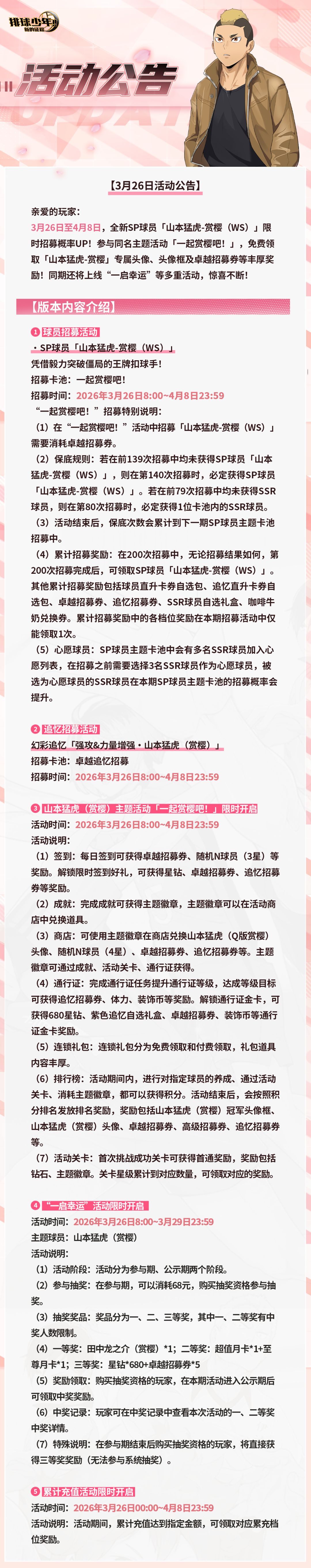 3月26日 ~ 4月8日,全新SP球员「山本猛虎-赏樱(WS)」招募概率限时UP!参与同名主题活动「一起赏樱吧!」限时开启,参与可获得山本猛虎(赏樱)专属头像、卓越招募券等丰厚奖励!