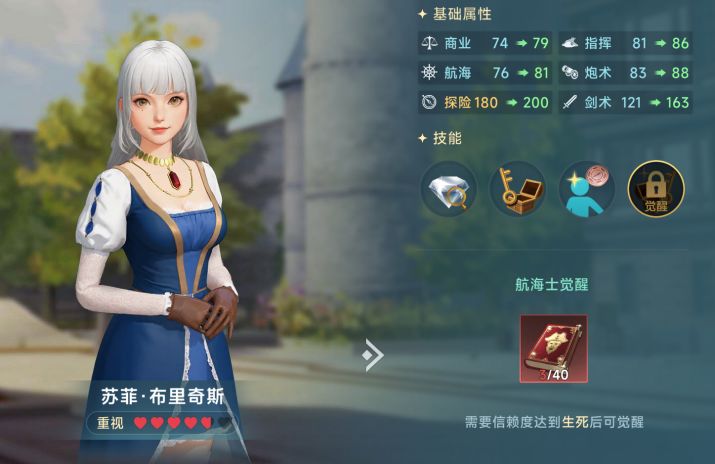 最高的探险属性,让你读图的时候可以获得更高的线索探寻率,搭配质变技能的寻宝率1%,直接提升所有开图的收益,简单粗暴但是好用。另外需要注意的是红海传奇任务技能需求比较高,如果没有苏菲的质变是不能成功完成整本传奇书的。接着是艾伦