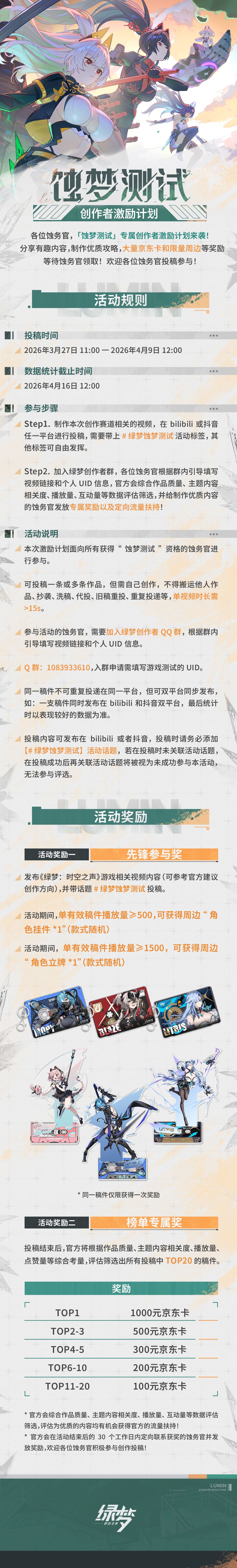 各位蚀务官,《绿梦:时空之声》「蚀梦测试」专属创作者激励计划来袭!分享有趣内容,制作优质攻略,大量京东卡和限量周边等奖励待您领取!