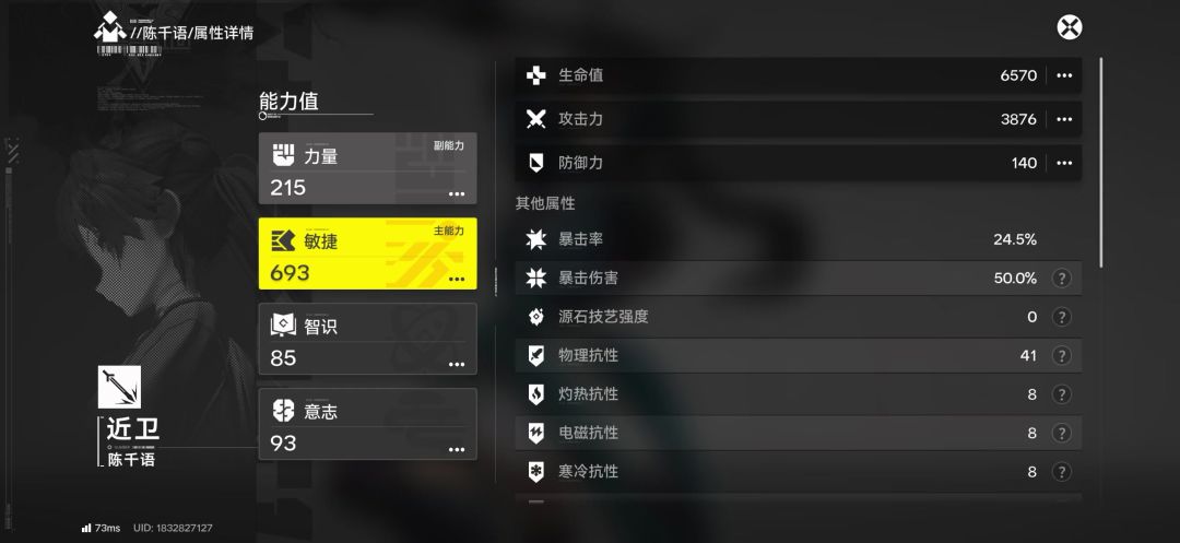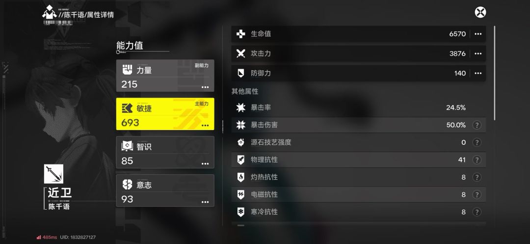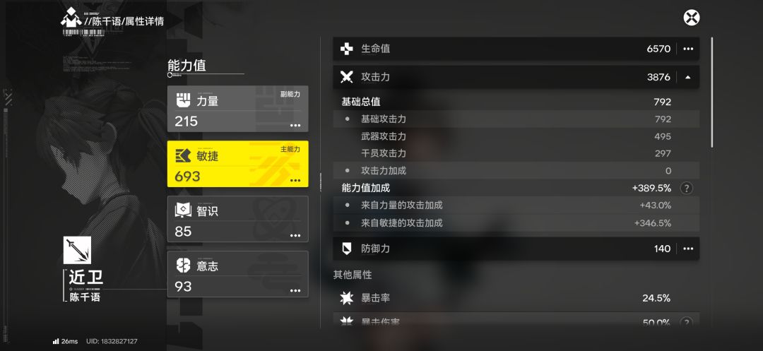 小陈属性:攻击3876-敏捷693-力量215-物伤67.8%-终结技加成56.1%