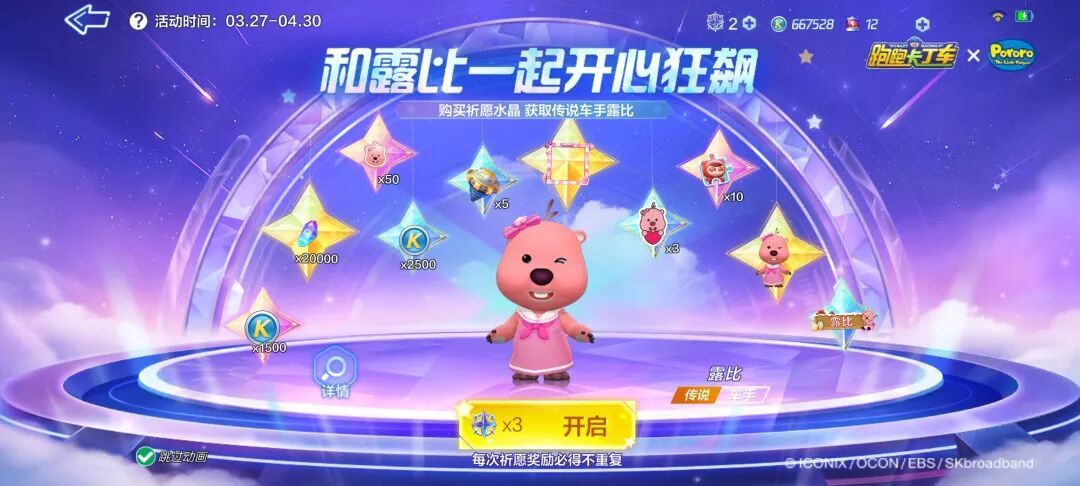 风靡全球的明星小海狸闪亮登场!粉色的可爱发卡,青春优雅的小裙子,露比就这样睁着扑闪圆润的豆豆眼,萌化全世界~3月27日起,啵乐乐的小伙伴海狸【露比】化身传说车手登陆【祈愿行动】,跨越次元与车友们并肩赛道,带来专属于露比的别样吸引力!