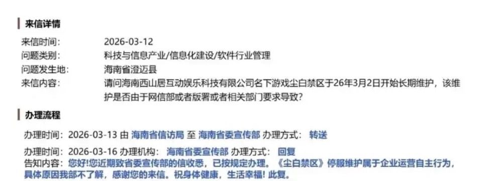 此前《尘白禁区》宣布停服后,网络上流传出“游戏因违规被相关部门叫停”的说法,该消息持续发酵,让不少玩家对停服原因充满猜测与担忧。而近日,有玩家晒出针对此事的信访回复截图,官方给出明确回应:游戏停服属于企业自主运营操作,并非网传的被相关部门勒令关停。