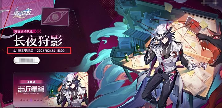 据悉,不死途的卡池页面明确标注:长夜狩影卡池结束时间:2026/03/24 15:00,而所有官方渠道均确认,4.1版本的服务器维护更新于 3月25日 完成,这产生了一个荒谬的逻辑:卡池在3月25日开启,却在 3月24日就已结束,这种结束时间早于开始时间的明显BUG,让卡池的持续时长变成了一个 负数,从而诞生了崩铁历史上首个负时长卡池这一极具戏剧性的说法![[TapTap表情|TapFamilyxdoro2_粉狗发射]](https://img-tc.tapimg.com/market/images/934f58613a089b2e214eb0e0638bbbad.gif)