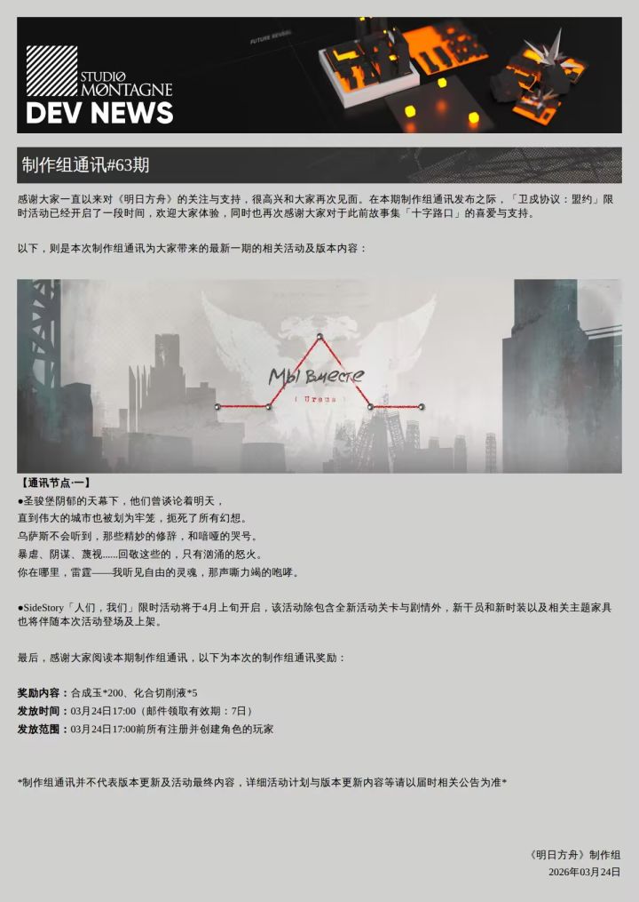 制作组通讯第63期确认,乌萨斯主题SideStory 人们,我们 将于4月上旬开启,包含全新活动关卡与剧情,新干员与新时装同步登场
