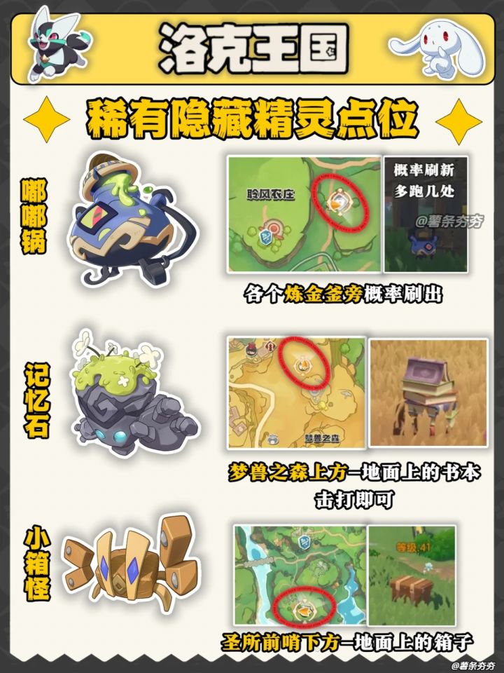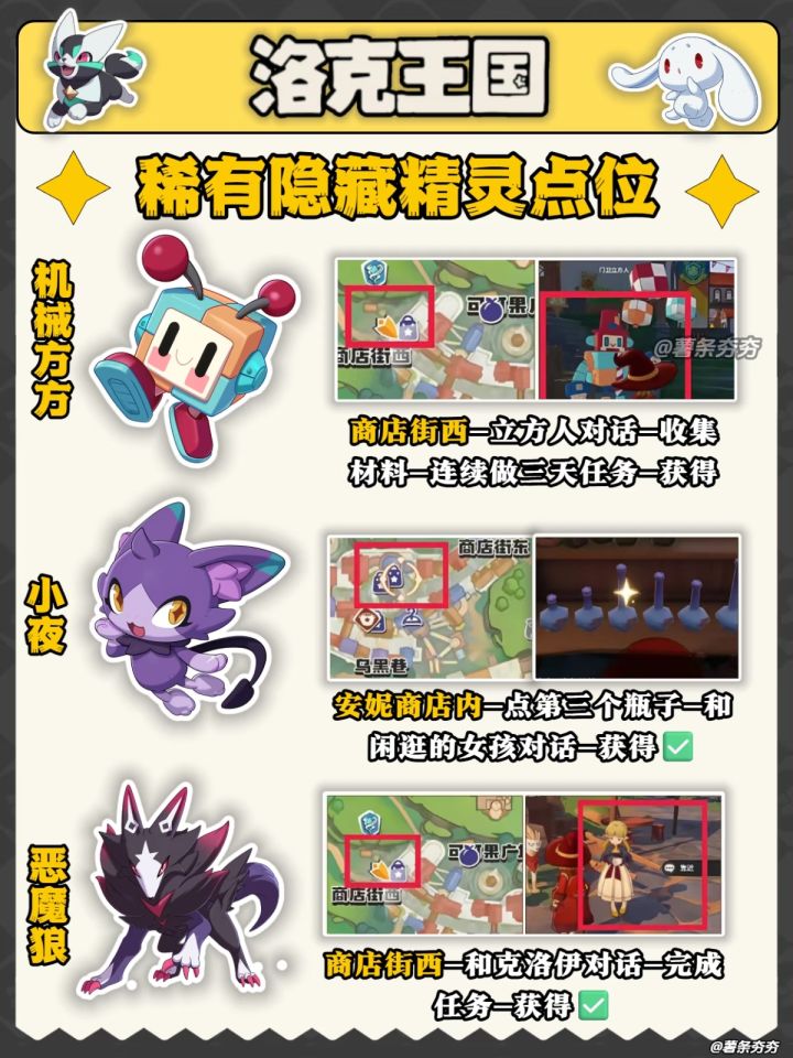 搬运,仅分享,来源薯条夯夯商店街&城镇篇 :机械方方:商店街西→找立方人对话→收集材料连做3天任务 小夜:安妮商店内→点第三个瓶子→和闲逛女孩对恶魔狼:商店街西→和克洛伊对话→完成任务直接脆筒甜甜:彼得大道甜品店→和店长对话解锁 野外探索篇 :嘟嘟锅:全图炼金釜旁→概率刷新,多跑几个点 位蹲守记忆石:梦兽之森上方→找到地面书本,击打触发 小箱怪:圣所前哨下方→找到地面箱子,交互