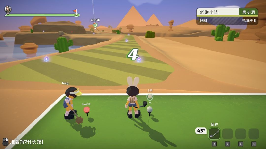 玩法方面,本作的基础玩法便是打高尔夫球,目标是进洞,进洞的越快、杆数越少分数越高。玩家挥杆时可以选择角度和力度,在左侧的力度显示中会显示落地区域的地形(如果目标点就在范围内也会显示一个小旗子),方便玩家判断距离。如果不慎打到河里的话(被其他玩家干扰掉进去也算,一竿子打到人身上弹飞了掉河里了谁懂),就会吃一个罚球晕眩,之后球会在玩家身边刷新。