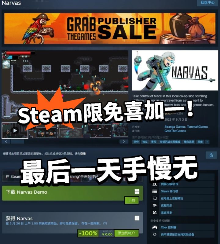 这款2D横版动作射击游戏支持中文,领取时间只有3天,截止到3月26日凌晨1点,错过这次免费机会,大概率要等上一年才能再遇到。